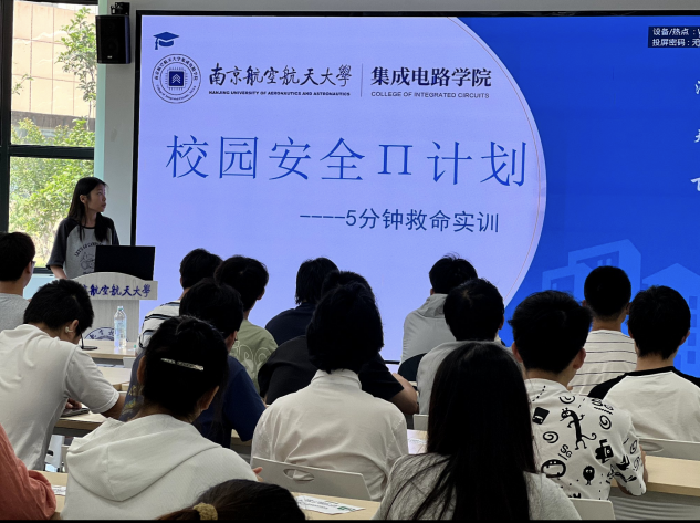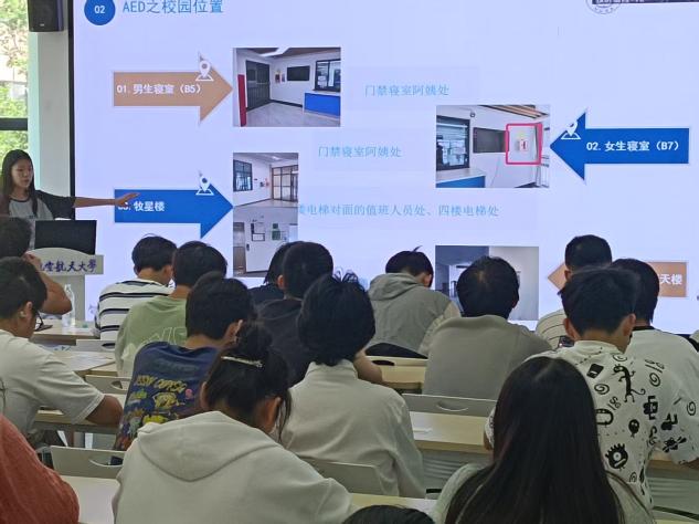 活动中,还特别设置了 AED 设备使用教学环节。学生骨干现场示范急救五步法,细致介绍AED 设备的使用及校内点位,确保“知位置、会操作”。