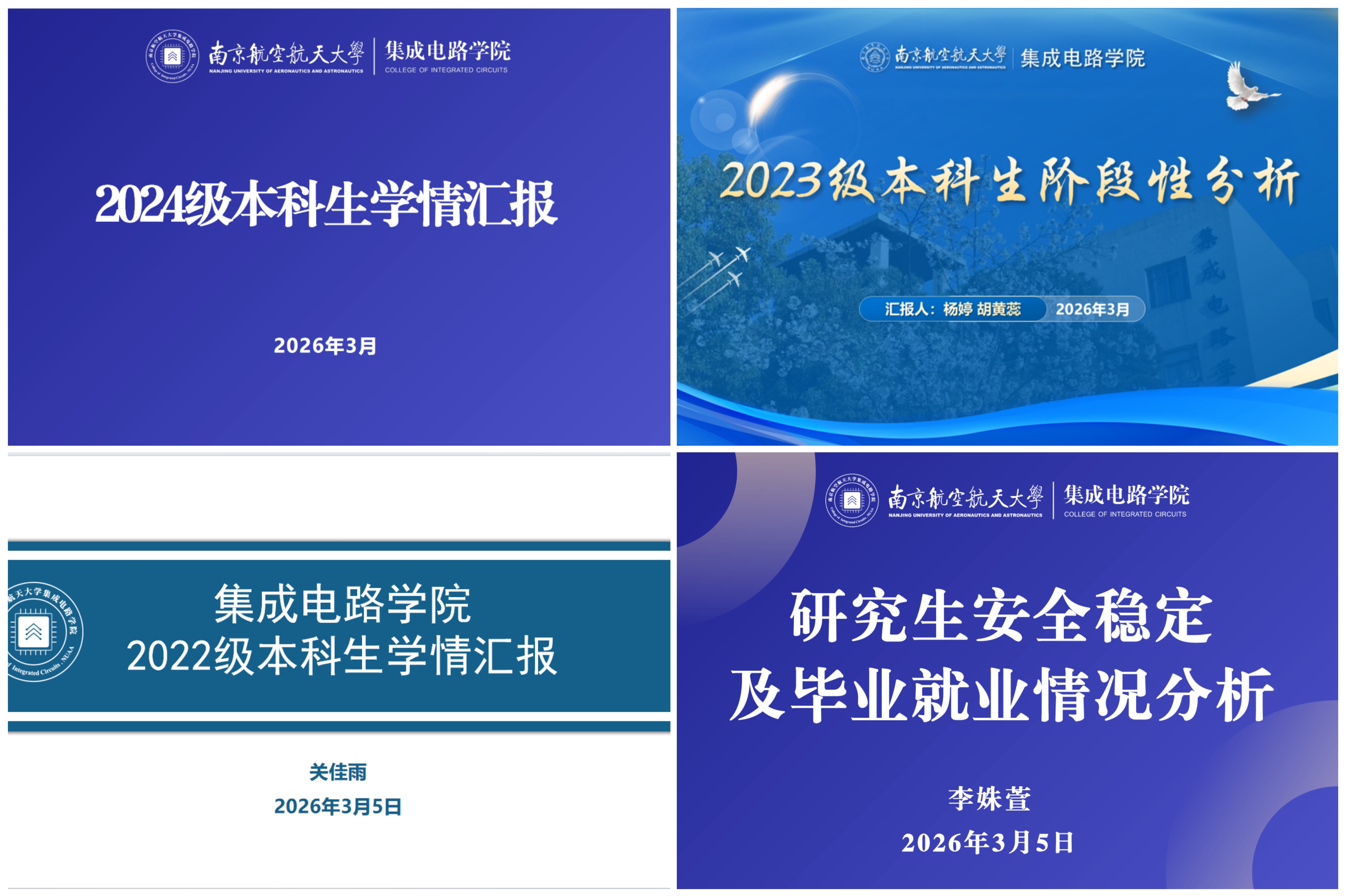各年级辅导员依次围绕本研学生培养工作作专题汇报。肖刘汇报了2024 级、2025 级本科生基本情况及学业绩点分布,并就心理异常、学业风险等重点学生的摸排跟进情况进行交流。胡黄蕊和杨婷汇报了2023 级本科生学情分析结果与毕业去向摸底情况,展示了学生升学意向分布与学业风险学生帮扶举措。关佳雨汇报了2022 级本科生考研整体情况,梳理了毕业风险学生排查结果与后续工作安排。李姝萱汇报了研究生返校情况、心理健康动态与毕业就业相关事宜;教务员祁珊汇报了 2026 届研究生学位论文送审结果与答辩工作整体安排。